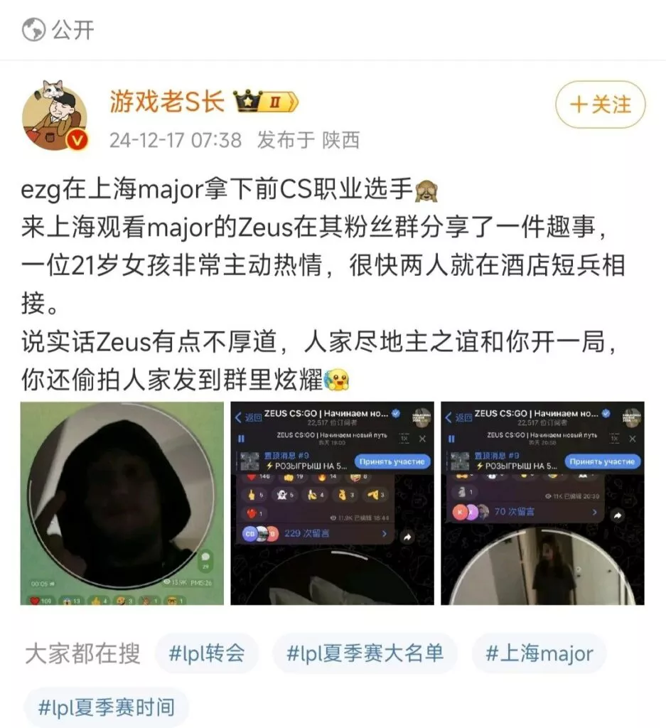 前职业《反恐精英:全球攻势》(CSGO)选手Zeus在其粉丝群中分享了一段与一位21岁上海女孩约会的视频。这位女孩是一名大学生,但随后被曝光她实际上还有一位19岁的男朋友。此外,Zeus本人也已婚。