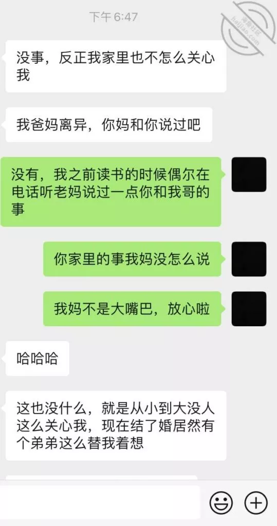 对了,写到这里,之前我打码的我哥发给我小嫂子的那个聊天记录里面, 我哥说因为我妈不同意我哥和他前女友在一起,他才相亲才和小嫂子结婚的,我不知道我哥这话是不是只是为了气小嫂子,但是可以想象,小嫂子当时应该挺难过的,记得当时他们两个结婚,我给小嫂子端洗脚水,小嫂子给我红包那会,她明明就像天下最幸福的女人,现在再想想他们这个家,想想小嫂子,真替小嫂子感到不值。
