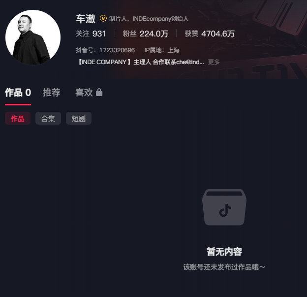 目前车澈相关抖音账户已清空全部作品