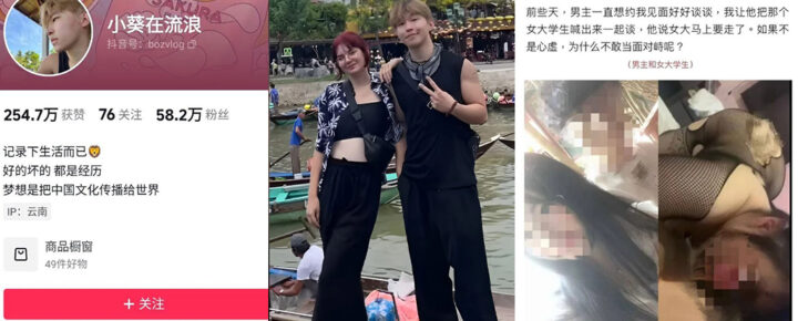 抖音58万粉丝旅游博主小葵在流浪被女友发文曝光pua出轨约炮